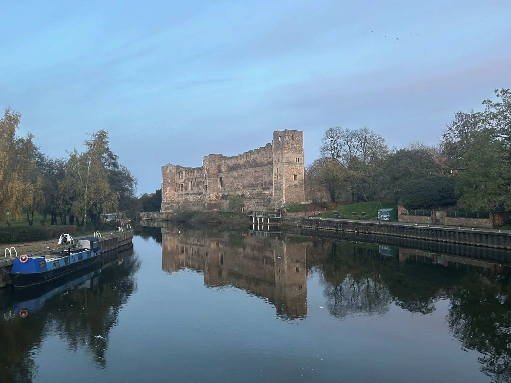 Historic castle ruins reflected in a calm river with a houseboat moored nearby, surrounded by trees and a clear sky.