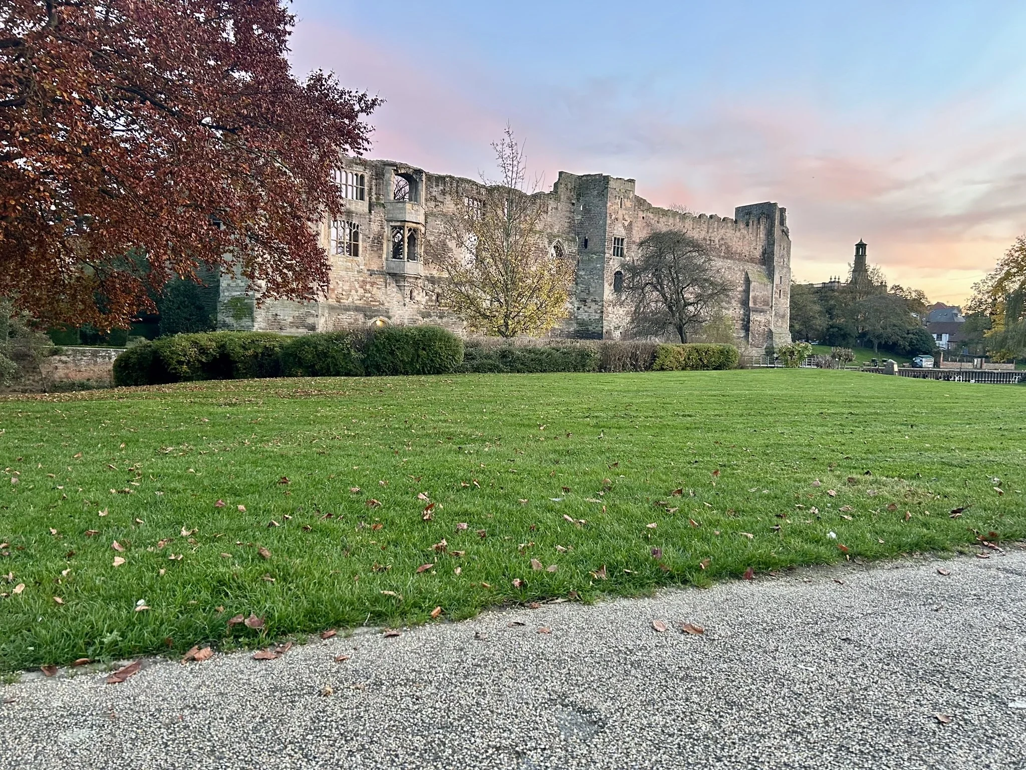 Historic stone castle with large grassy lawn in foreground, surrounded by trees with autumn foliage, under a sunset sky.