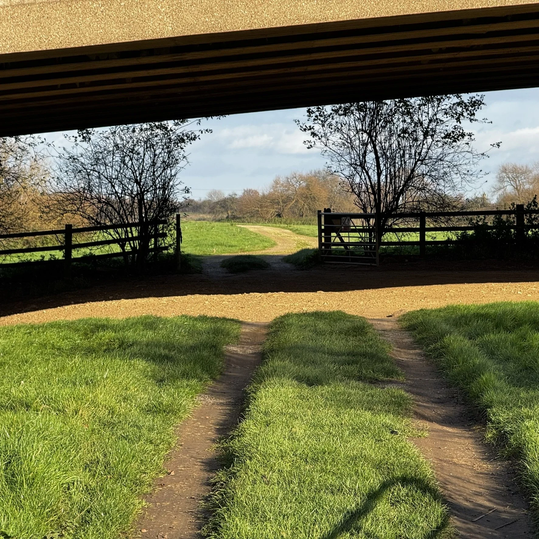 View from under a bridge showing a gravel path leading to a fence and gate, with grass and trees in a rural landscape.