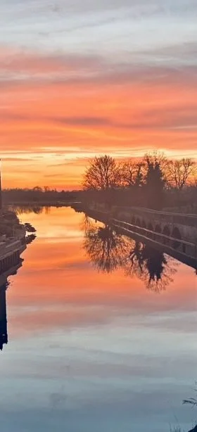A serene river scene at sunset with trees lining both sides, reflecting the orange and pink hues of the sky on the water's surface.