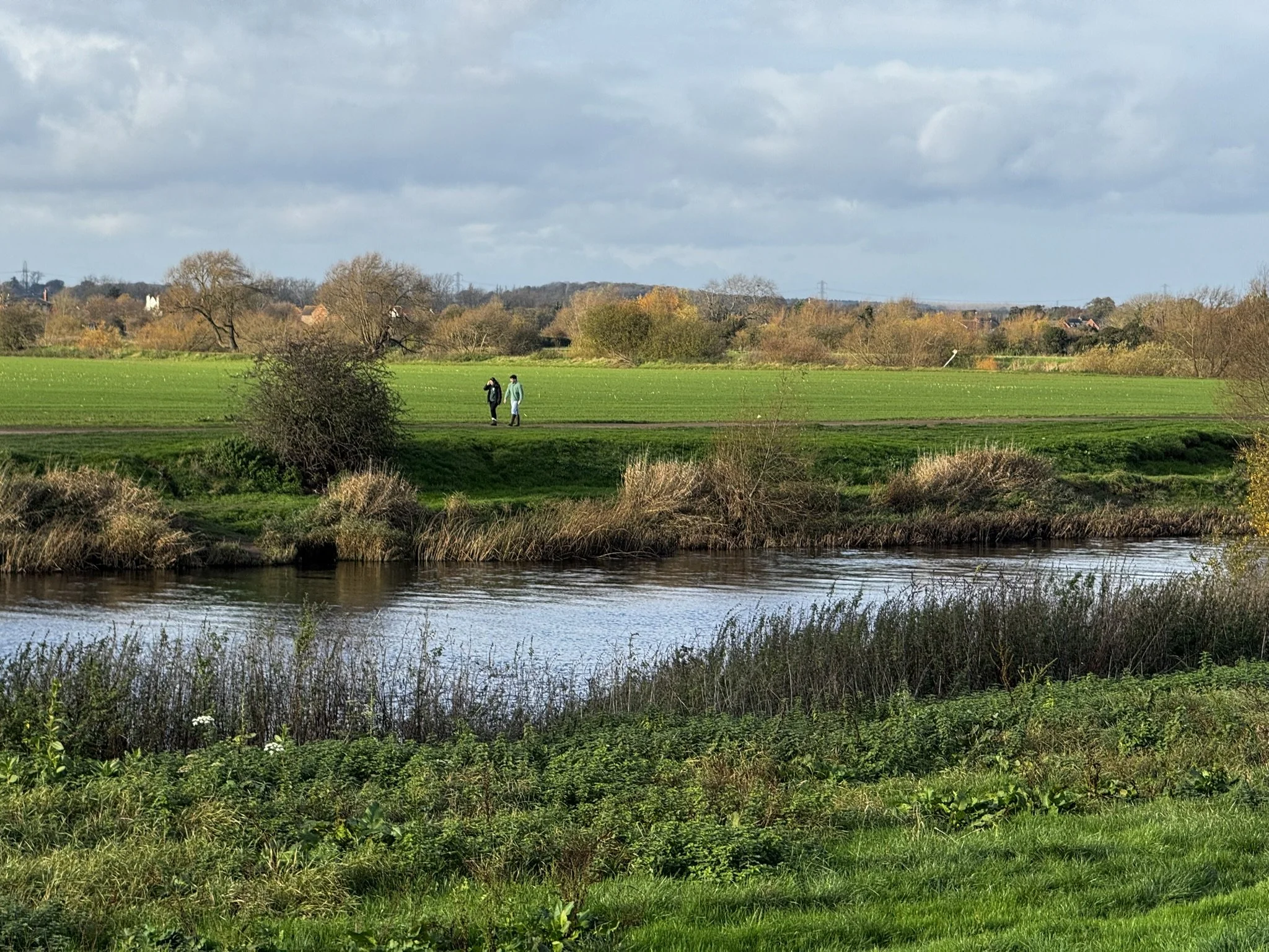 Two people walking on a riverside path in a grassy landscape with trees in the background.