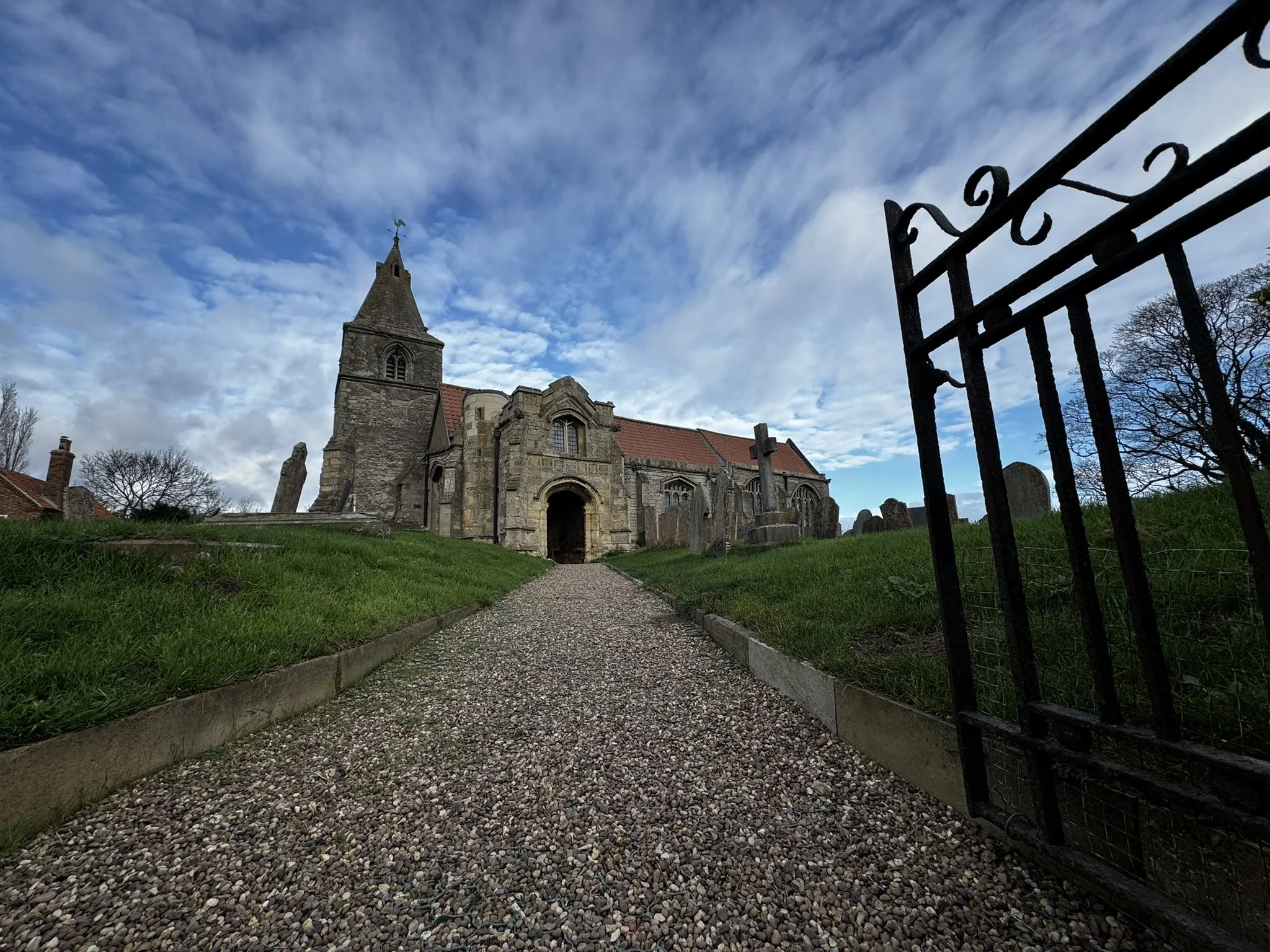 Historical stone church with tower, path leading to entrance, surrounded by graveyard and wrought iron fence, under partly cloudy sky.