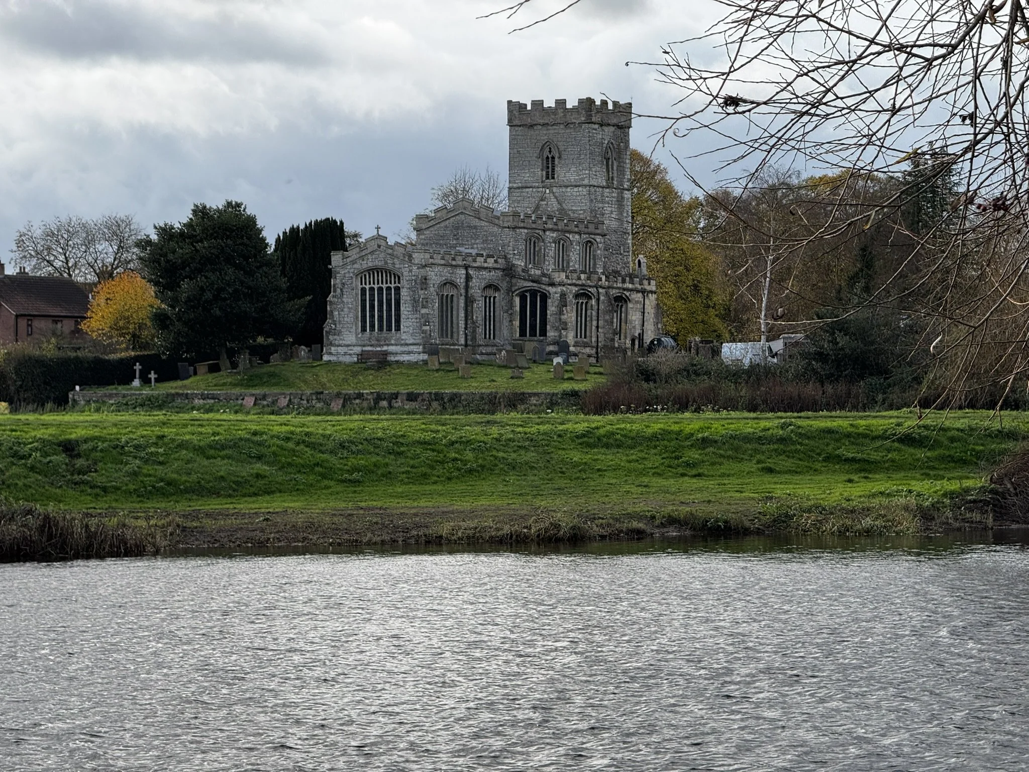 Historic stone church with tower near river, surrounded by trees, against cloudy sky.